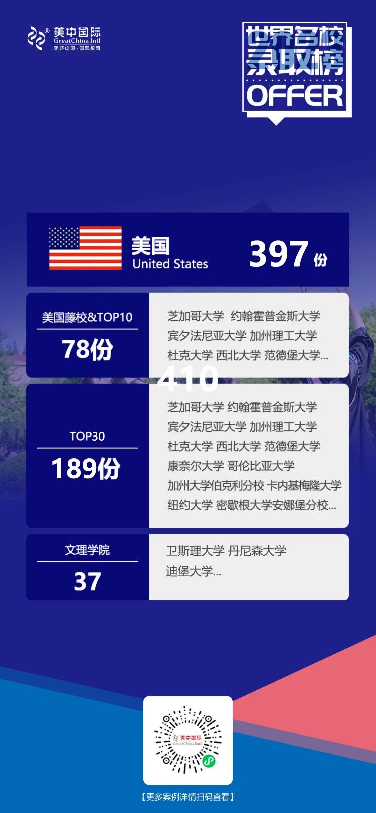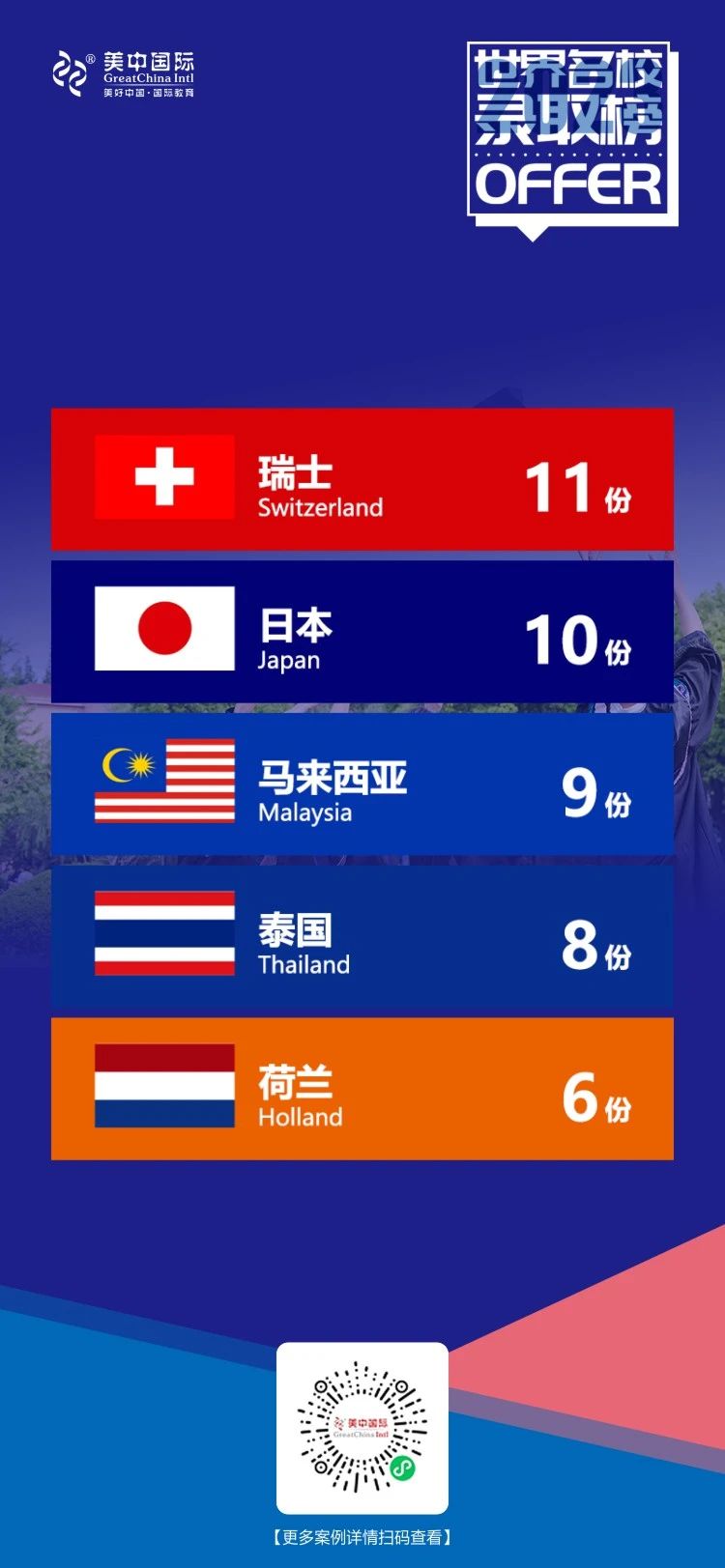 ⭐其他地区,美中国际一直以来关注全球留学,日本、瑞士、马来西亚、泰国和荷兰皆有所收获。在2022年美中国际专门成立日本留学中心,同时推出亚洲精英计划,更加针对性地为申请者提供服务。