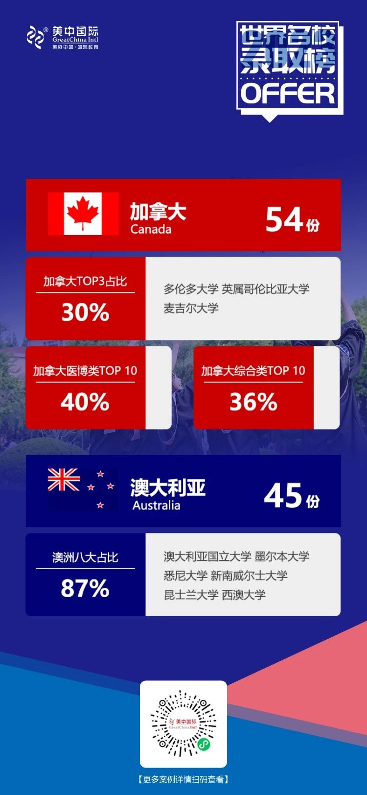⭐澳加方面,美中国际学子保持稳中有进的录取势头,加拿大医博类/综合类TOP10录取占比最高,澳洲八大录取占比87%。